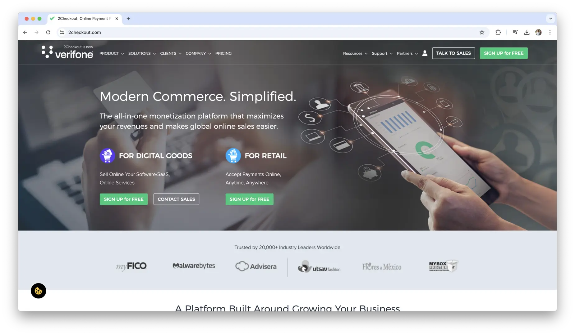 2Checkout, now rebranded as Verifone, is a global payment gateway that supports transactions in over 200 countries and accepts more than 45 currencies. It’s an ideal choice for businesses looking to sell internationally, with a strong focus on simplifying the process for both merchants and customers.