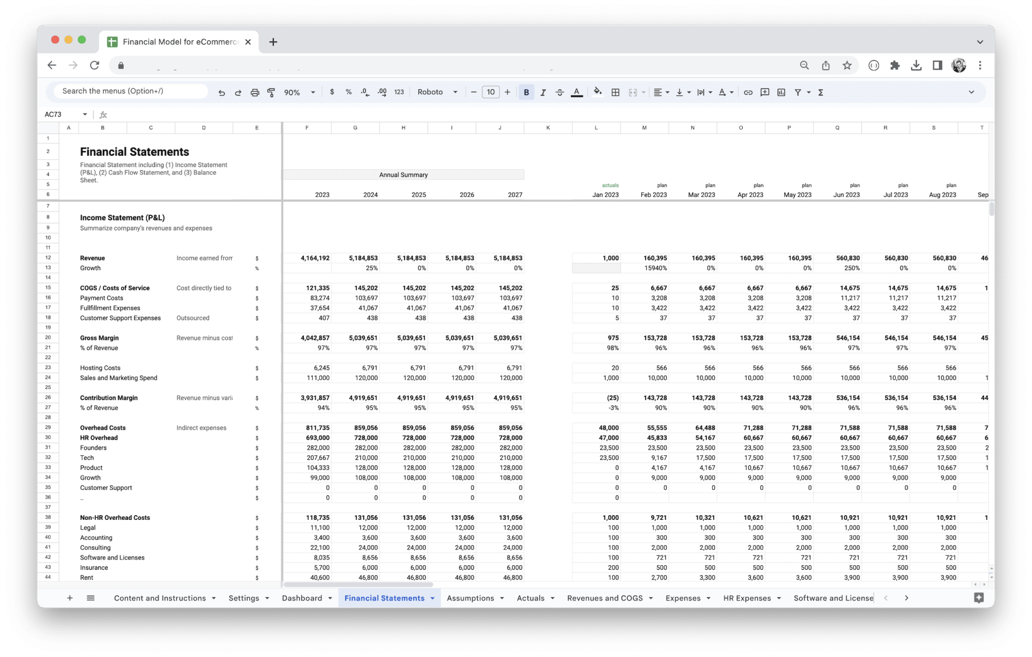 Revenue is the lifeblood of your e-commerce business. It’s essential to accurately capture and forecast every source of income in your financial model. E-commerce businesses can have multiple revenue streams, each of which needs to be tracked separately for a holistic view of financial performance.