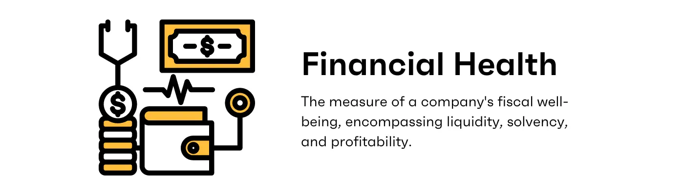 Financial health refers to the overall state of a business's financial affairs, including its ability to generate revenue, manage expenses, and withstand economic challenges. It encompasses various factors such as liquidity, solvency, profitability, and efficiency, which collectively determine the financial well-being and stability of a business.